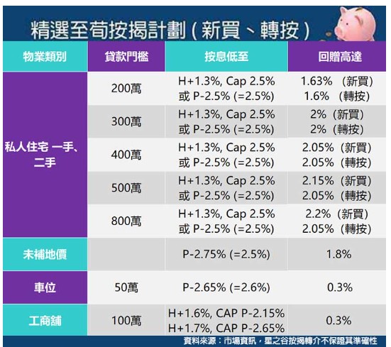 現時銀行H按最佳利率為H+1.3%。新買總按揭現金回贈高達2.2%、轉按2.05%。